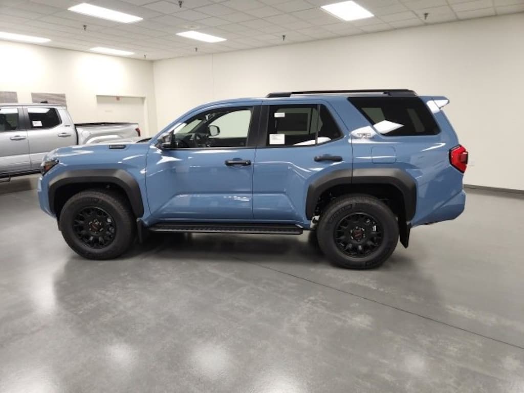 - Black honeycomb-style grille, mirror caps, door handles, and overfenders; color-keyed rear spoiler; black "trd off road" and "4runner" badges.