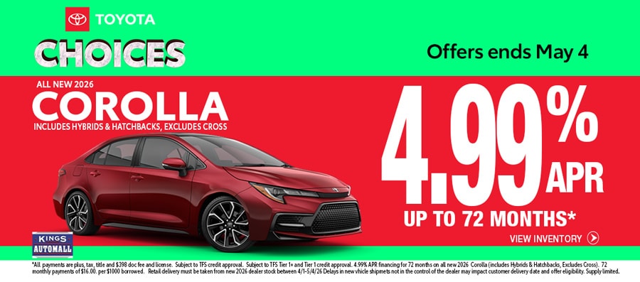 Enjoy 2026 Toyota deals from the comfort of your home. Complete your financing paperwork from the comfort of your couch with at-home financing, and then pick-up and go home in your new Toyota Camry or Corolla!